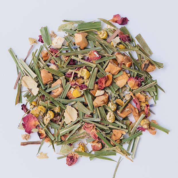 レモングラス、アップル、ローズペタル、リンデン、カモミールジャーマン、オレンジピール、ラベンダー、ステビアリーフ、アイブライト、メグスリの木