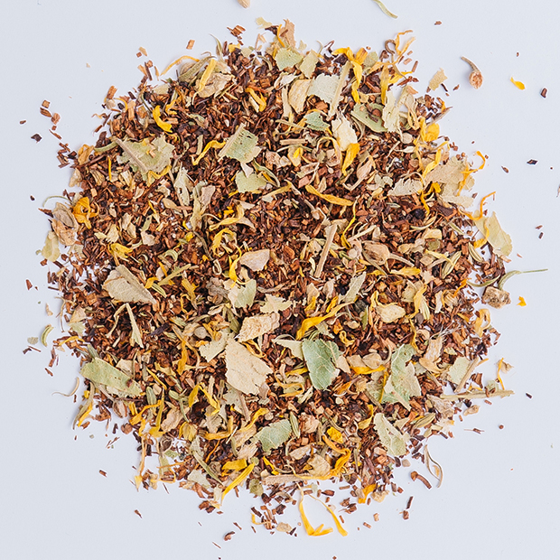 ルイボス、ハニーブッシュ、リンデン、生姜、マリーゴールド、フェンネル、ステビアリーフ、香料